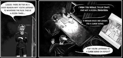 *In Phonogram the idea that music is magic is made literal, with phonomancers those who can manipulate this power. Incidentally, the idea that songs are spells is best encapsulated in a small backup story in this issue, written by Gillen and drawn by Sarah Gordon, called Everything is Nothing, in which a Taylor Swift song that reminds a guy of a recent breakup is referred to as a "curse song". The man is question is compelled to play it seventeen times back to back and it summons his ex's ghost... because metaphor. It's a really good backup story.